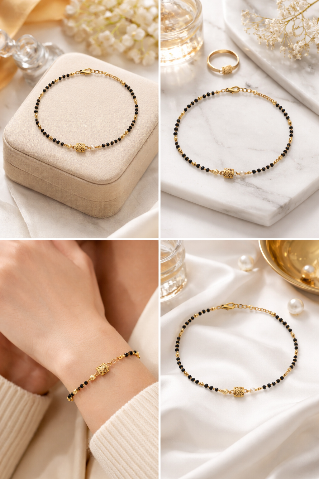Elegant Black Bead Gold Bracelet with Pearl Detailing