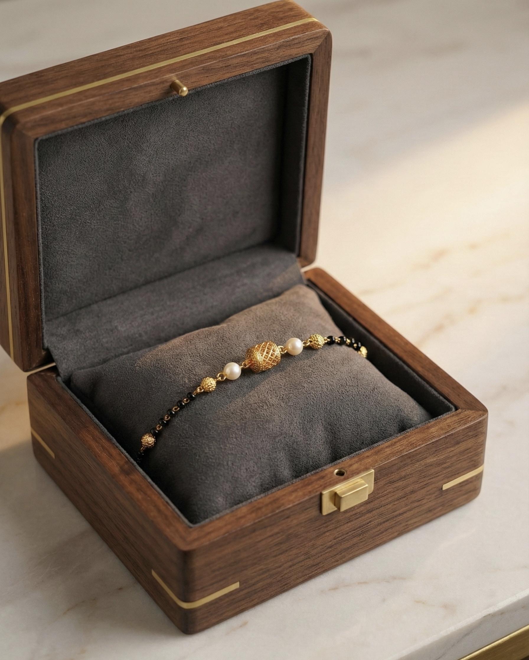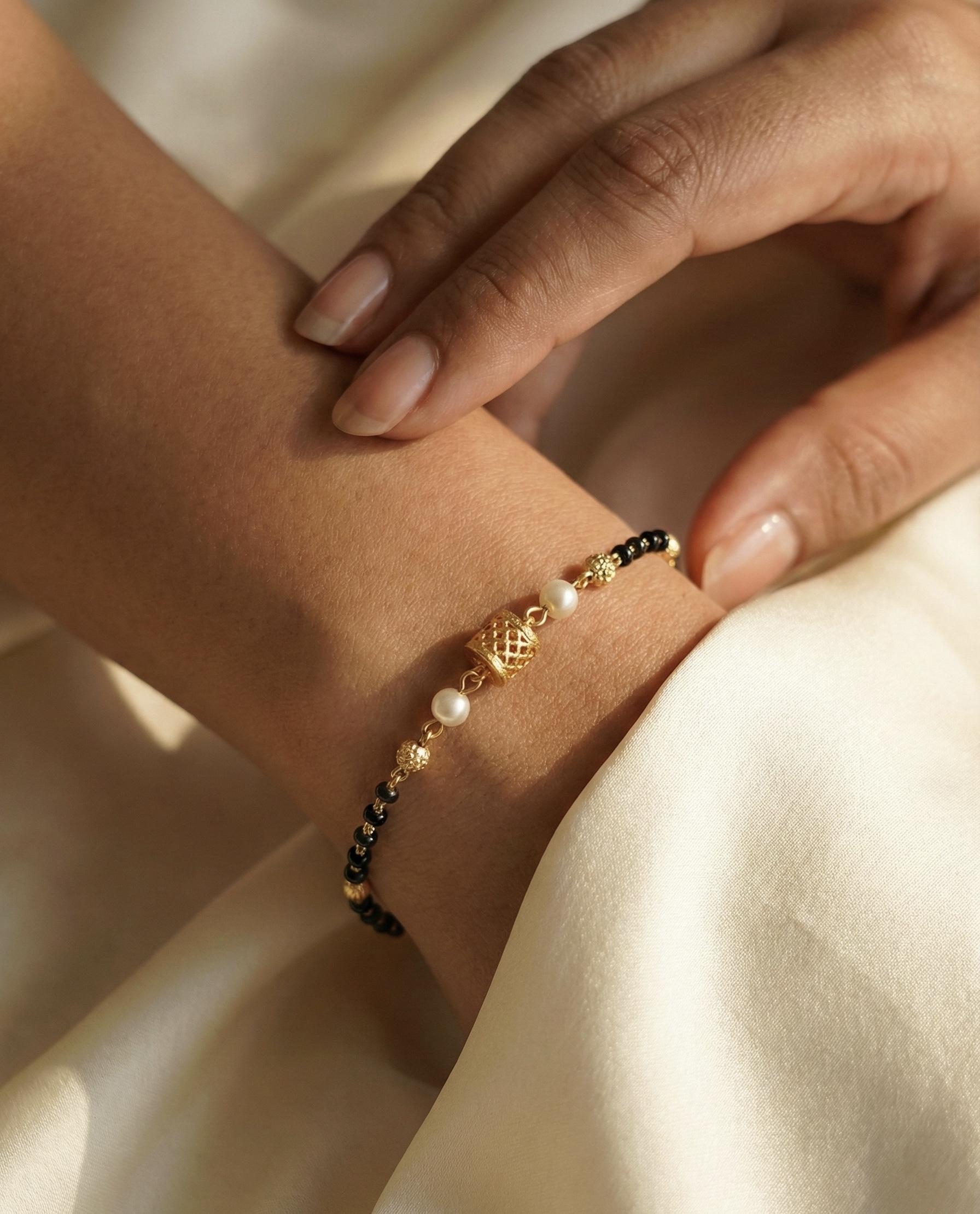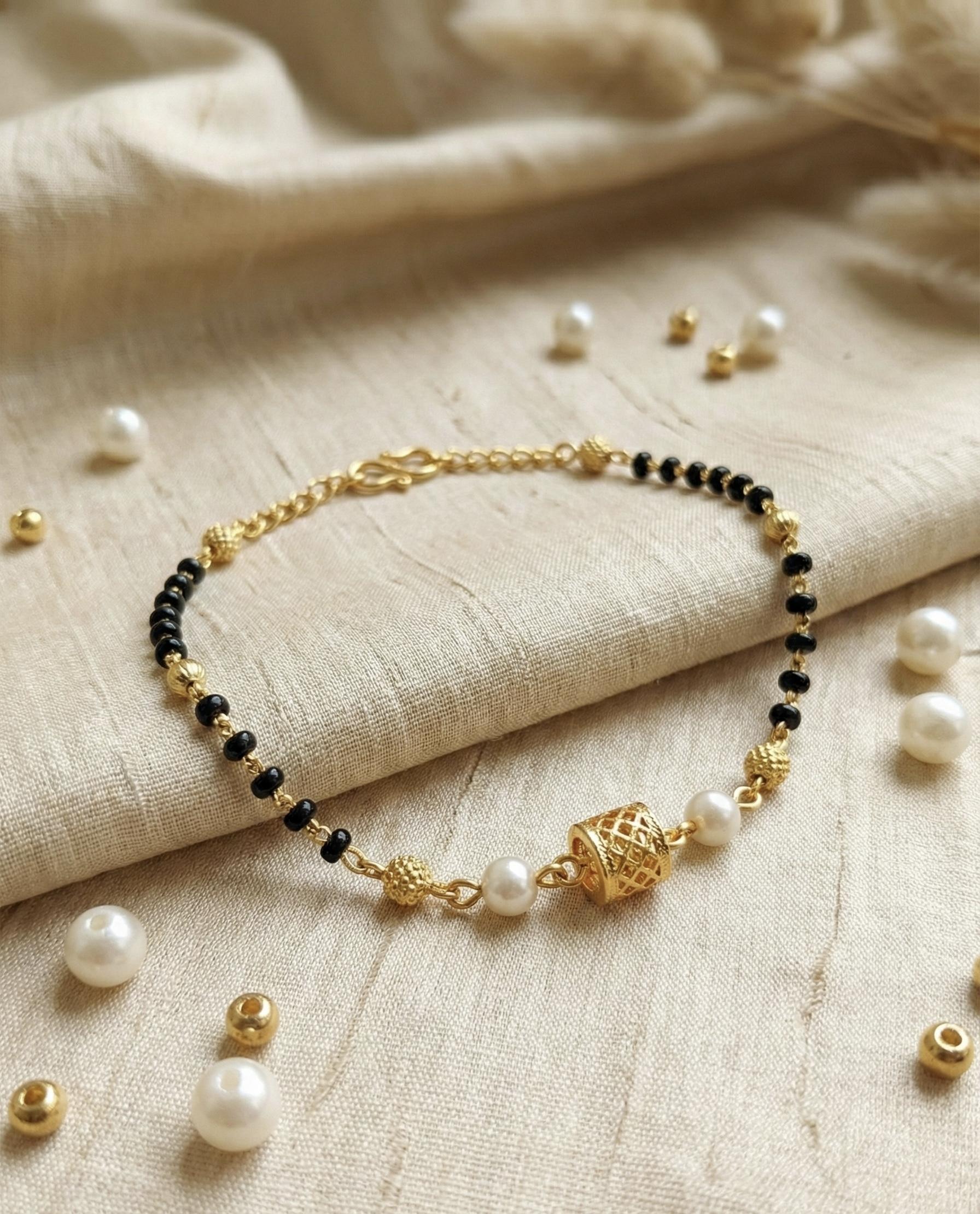 Elegant Black Bead Gold Bracelet with Pearl Detailing
