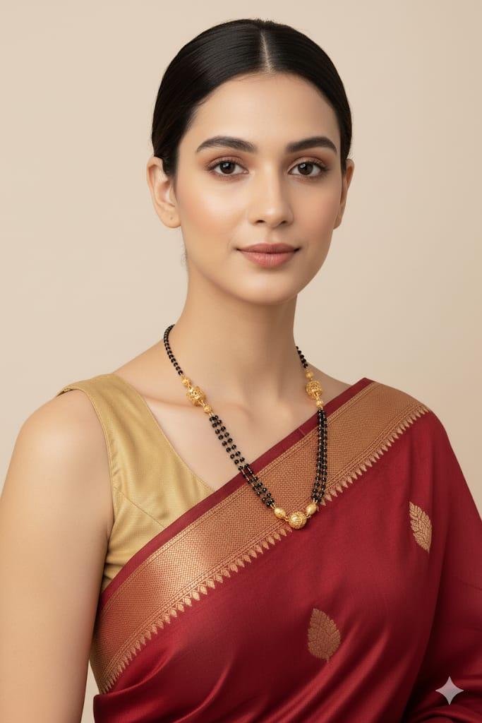 • TRADITIONAL DESIGN: Double-layered black glass beads with gold-plated chain and ornate pendant, crafted in authentic mangalsutra style for timeless elegance